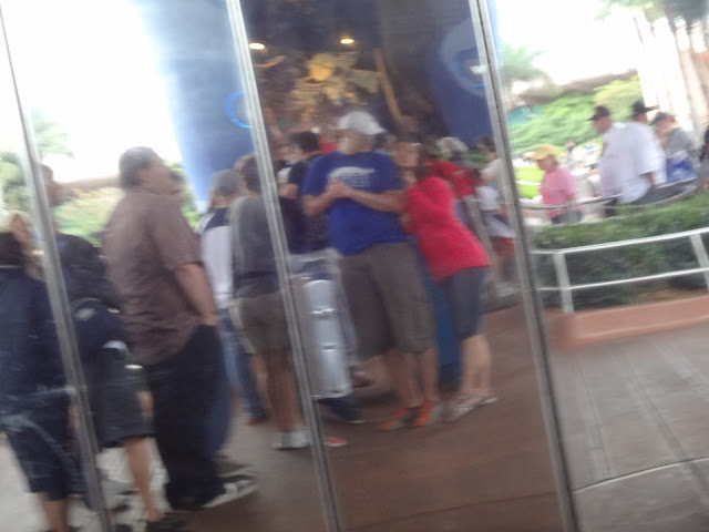 Here is proof that we did. This is us standing in line for the ride, which was a weird travel through time thing. But hey, CHECK, now Boyd has been inside the giant ball.