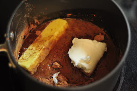 In a medium pot combine Shortening, Oleo (I had no clue oleo meant margarine), water and cocoa powder. Stir on Medium heat until shortening and oleo are melted. Do not boil.